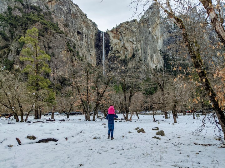 Yosemite Valley has several walking paths suitable for strollers. In case of heavy snow, however, a child carrier backpack is the safest choice.